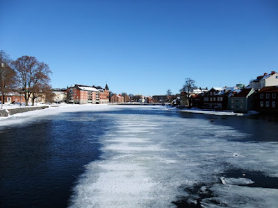 Bara för att ni ska få se framstegen med issmältningen på ån så blir det nästan en repris på den bild jag visat de senaste två dagarna. Här är en bild från dagens morgonpromenad, och som man ser så gjorde gårdagens solsken en hel del för att smälta bort isen. Snart ligger nog hela ån isfri, men det lär ju ta ett tag innan snön på marken är borta helt.